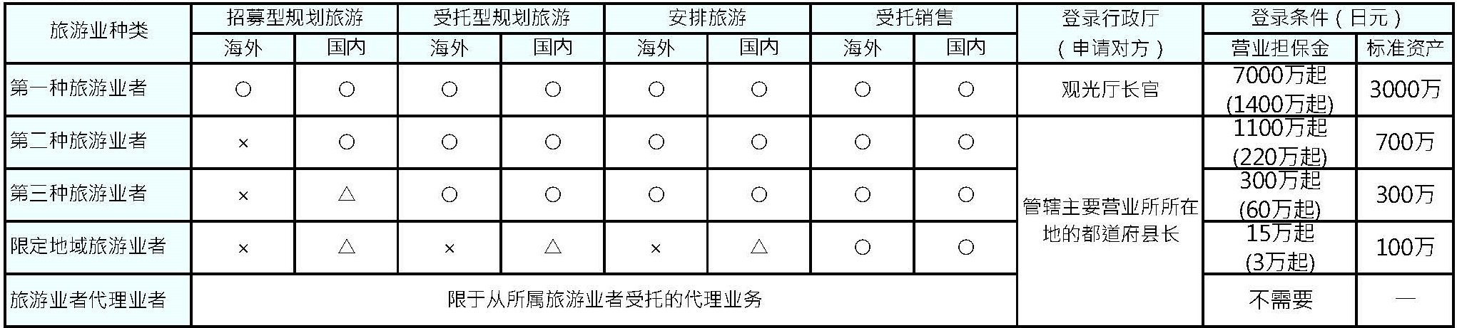 △:拠点区域内(自らの営業所の存する市町村及び隣接市町村並びに観光庁長官の定める地域)でのみ実施できる。