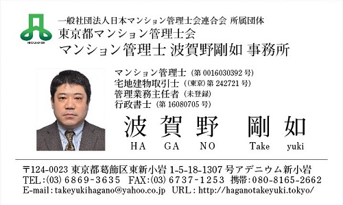 注②:当事務所代表は、行政書士資格を有するマンション管理であり、「法律事件」(権利義務や事実関係に関して関係当事者間に法的主張の対立があり、制度的に訴訟などの法的紛争解決を必要とする案件)に関する「法律事務」(弁護士法72条)をお受けすることはできません。このような案件につきましては、弁護士(又は訴訟の目的の価額が140万円を超えない簡易裁判所が裁判権を有するものについては、いわゆる認定司法書士(司法書士法2条1項6号・7号))にご相談ください(ご希望がございましたら、弊事務所の提携弁護士事務所(又は認定司法書士事務所)をご紹介させて頂くこともできます。)。 |