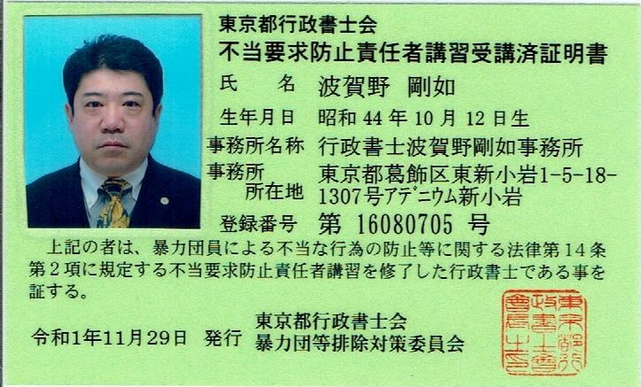 非常感谢向行政书士波贺野刚如事务所的咨询。
